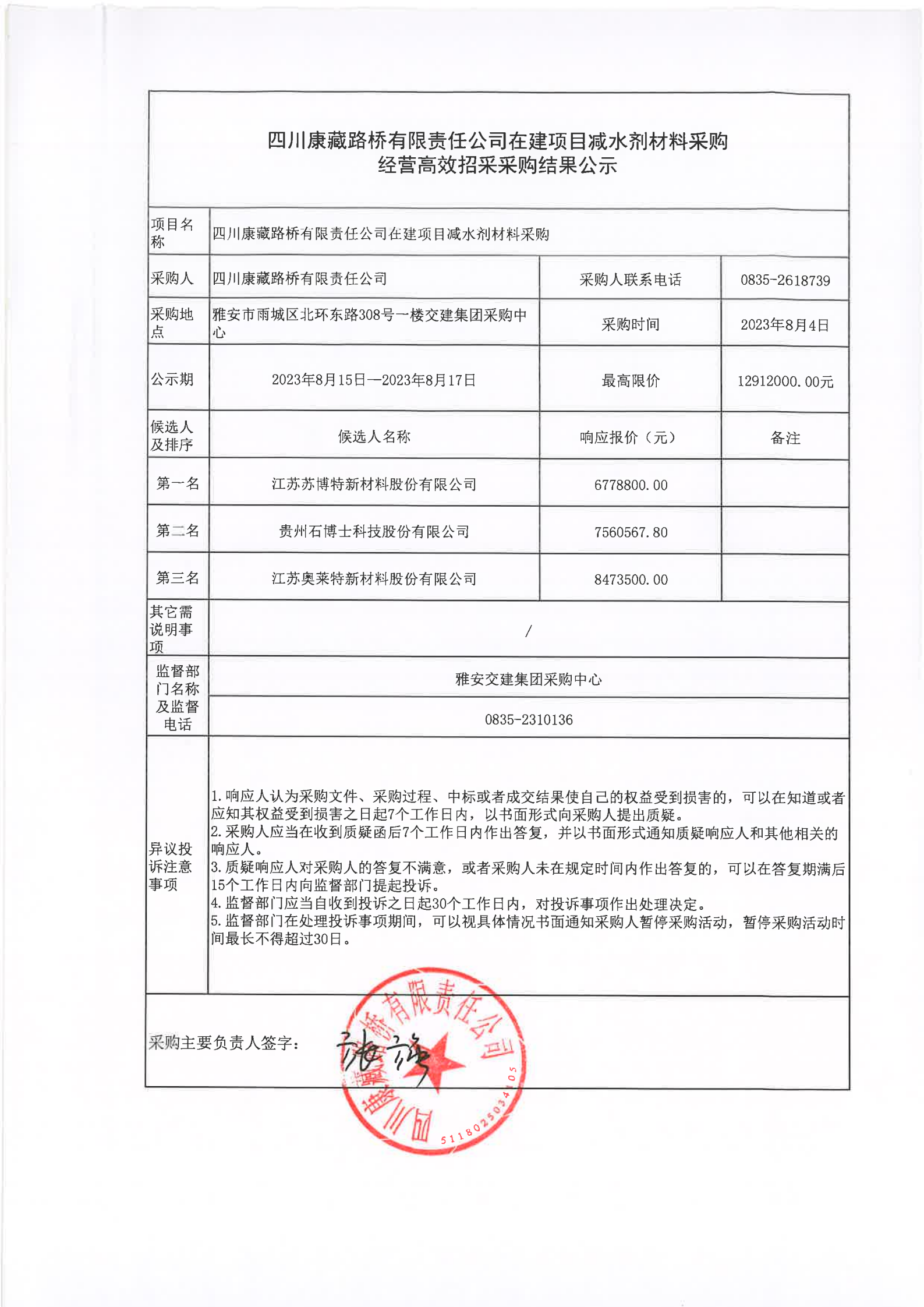 四川康藏路橋有限責(zé)任公司在建項目減水劑材料采購經(jīng)營高效招采采購結(jié)果公示