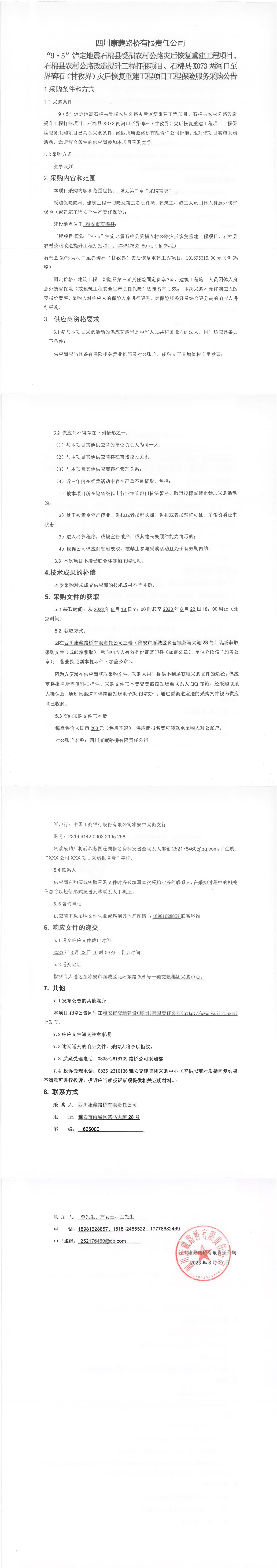 四川康藏路橋有限責(zé)任公司“9·5”瀘定地震石棉縣受損農(nóng)村公路災(zāi)后恢復(fù)重建工程項(xiàng)目、石棉縣農(nóng)村公路改造提升工程打捆項(xiàng)目、石棉縣X073兩河口至界碑石(甘孜界)災(zāi)后恢復(fù)重建工程項(xiàng)目工程保險(xiǎn)服務(wù)采購公告