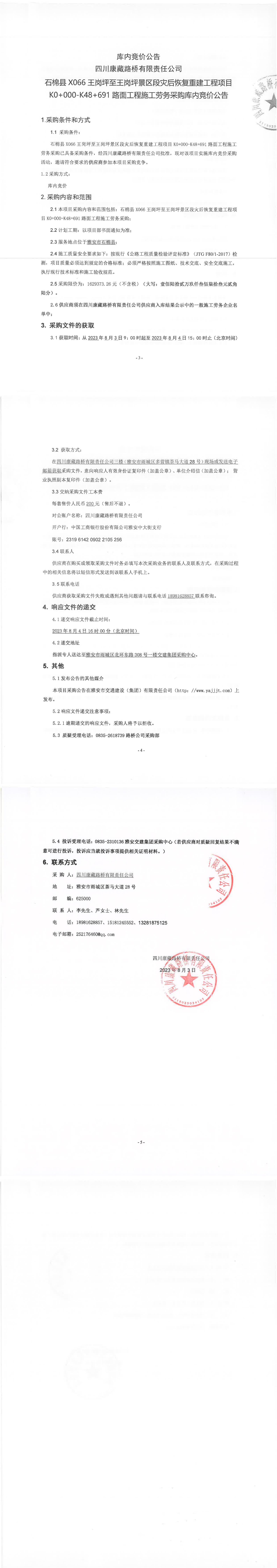 四川康藏路橋有限責(zé)任公司石棉縣X066王崗坪至王崗坪景區(qū)段災(zāi)后恢復(fù)重建工程項(xiàng)目K0+000-K48+691路面工程施工勞務(wù)采購(gòu)庫(kù)內(nèi)競(jìng)價(jià)公告