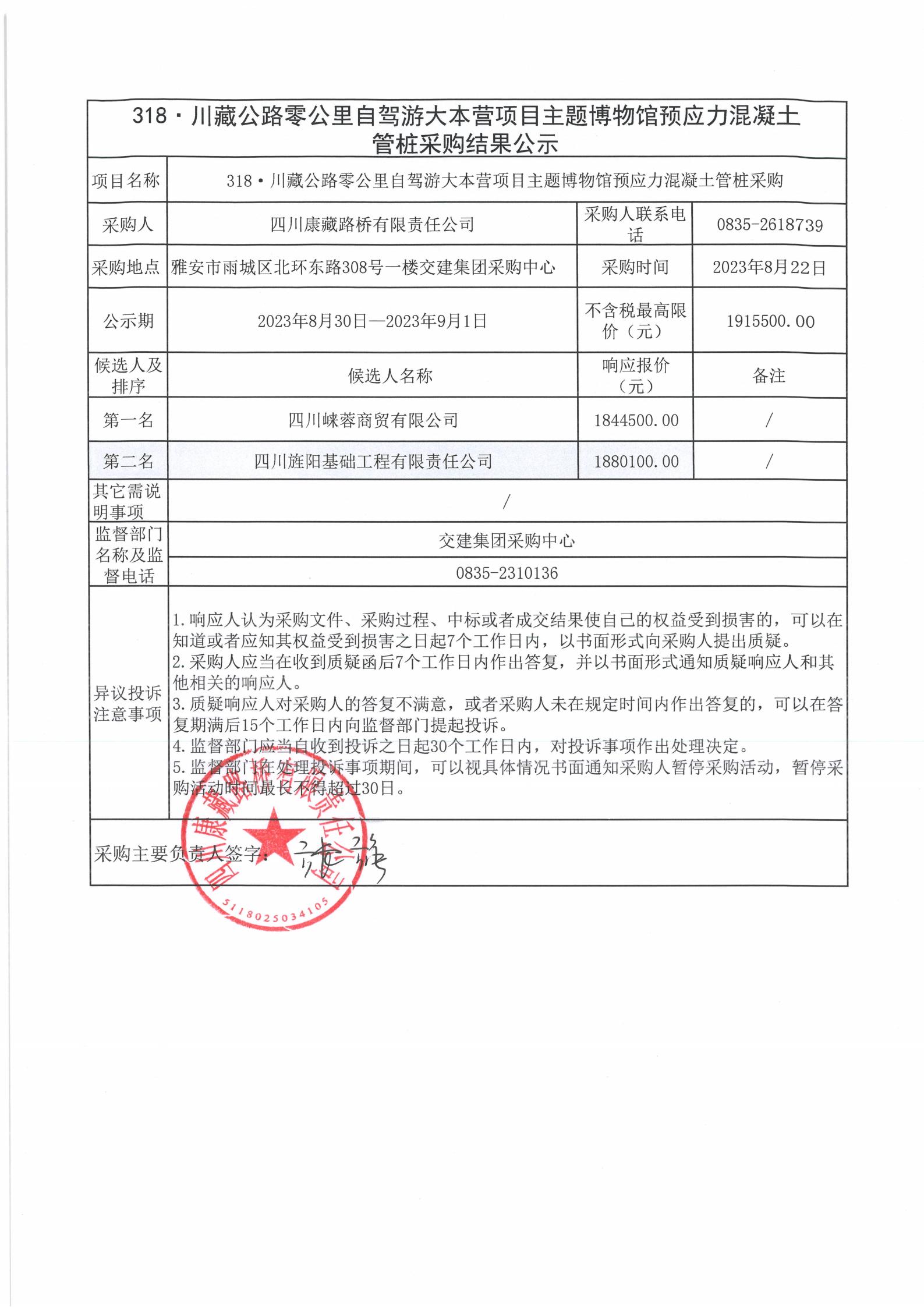 四川康藏路橋有限責任公司318·川藏公路零公里自駕游大本營項目主題博物館預應力混凝土管樁采購結(jié)果公示