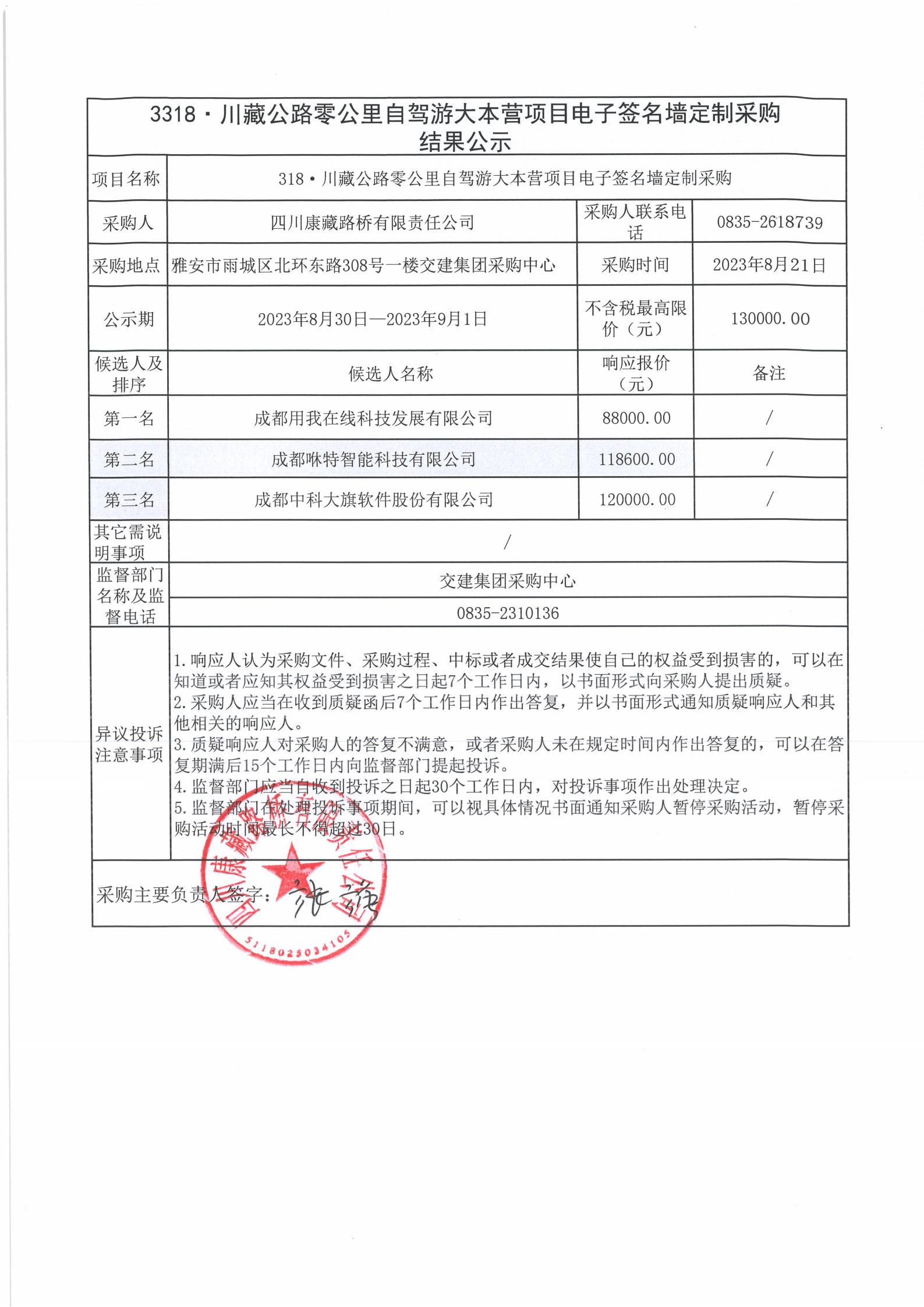 四川康藏路橋有限責任公司318·川藏公路零公里自駕游大本營項目電子簽名墻定制采購結果公示