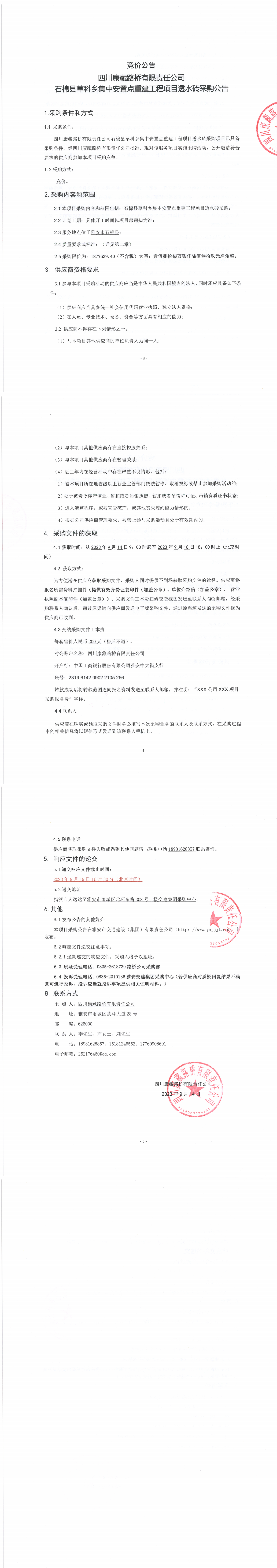 四川康藏路橋有限責(zé)任公司石棉縣草科鄉(xiāng)集中安置點(diǎn)重建工程項(xiàng)目透水磚采購(gòu)公告