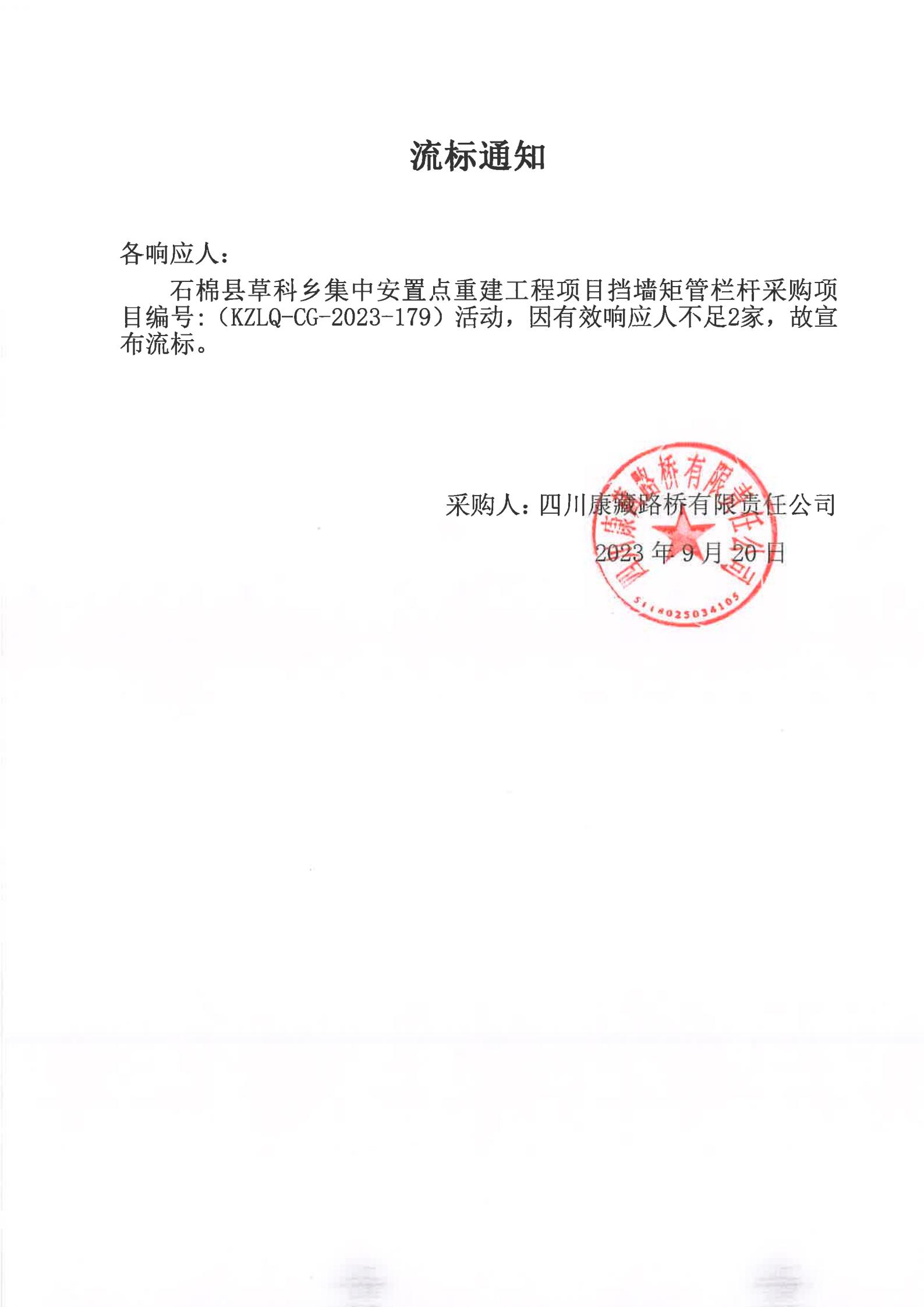 四川康藏路橋有限責任公司石棉草科鄉(xiāng)集中安置點重建工程項目擋墻矩管欄桿采購項目流標通知
