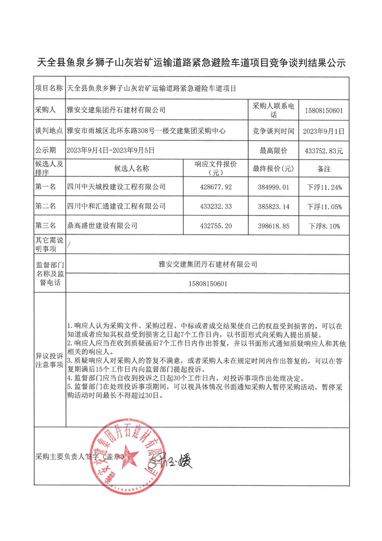 雅安交建集團丹石建材有限公司天全縣魚泉鄉(xiāng)獅子山灰?guī)r礦運輸?shù)缆肪o急避險車道項目競爭談判結果公示