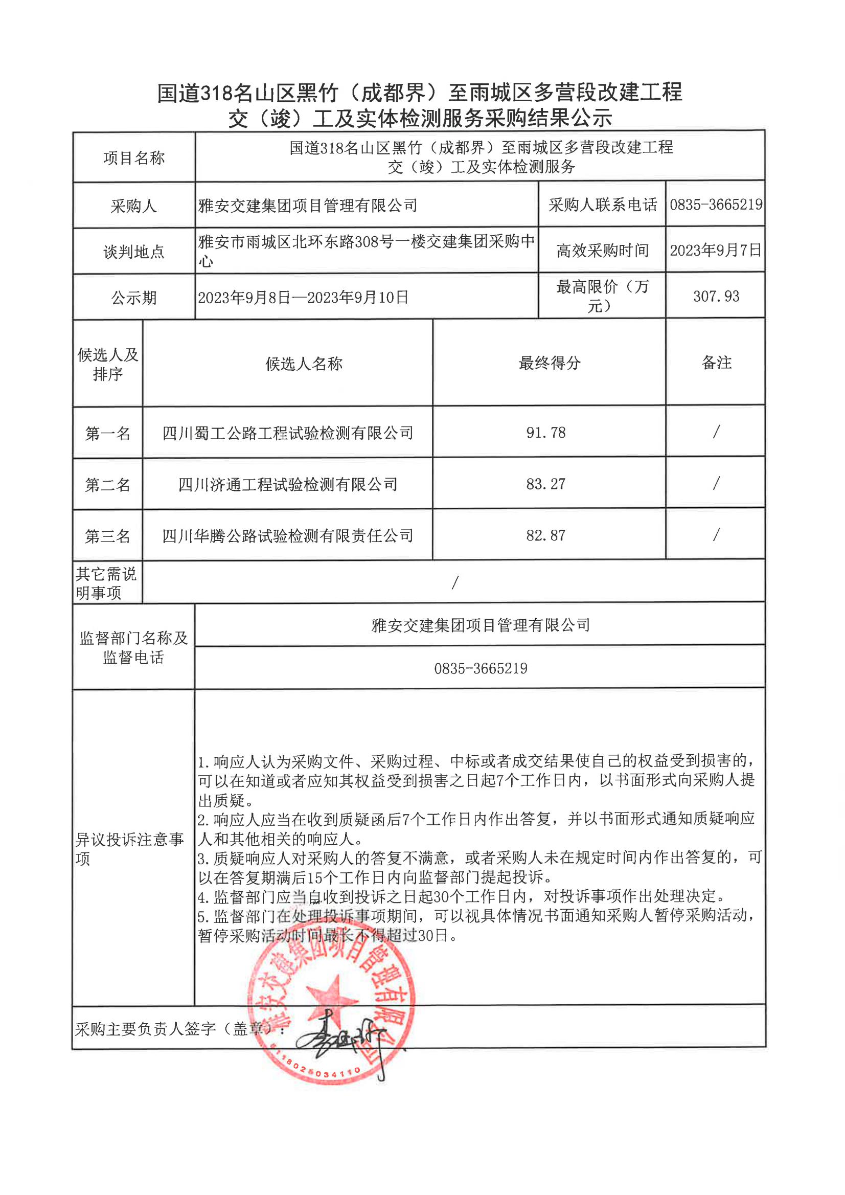 雅安交建集團項目管理有限公司國道318名山區(qū)黑竹(成都界)至雨城區(qū)多營段改建工程交(竣)工及實體檢測服務采購結果公示