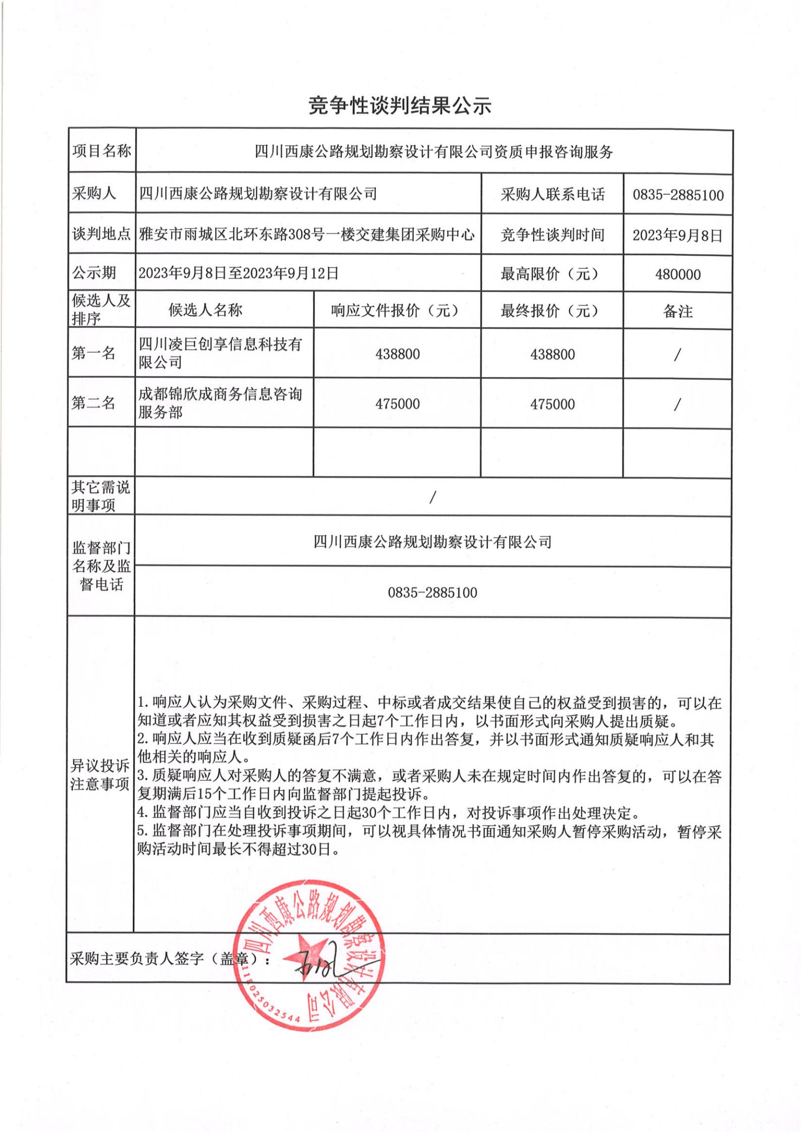 四川西康公路規(guī)劃勘察設(shè)計(jì)有限公司資質(zhì)申報(bào)咨詢(xún)服務(wù)競(jìng)爭(zhēng)談判結(jié)果公示