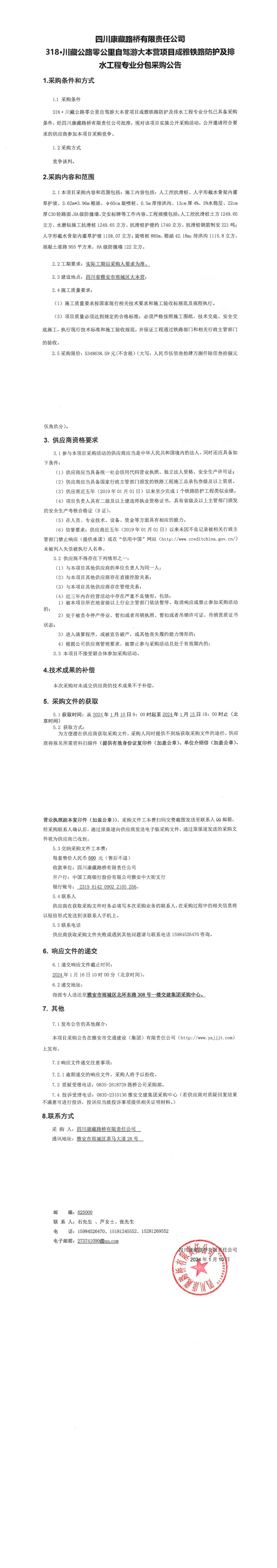 四川康藏路橋有限責任公司318·川藏公路零公里自駕游大本營項目成雅鐵路防護及排水工程專業(yè)分包采購公告