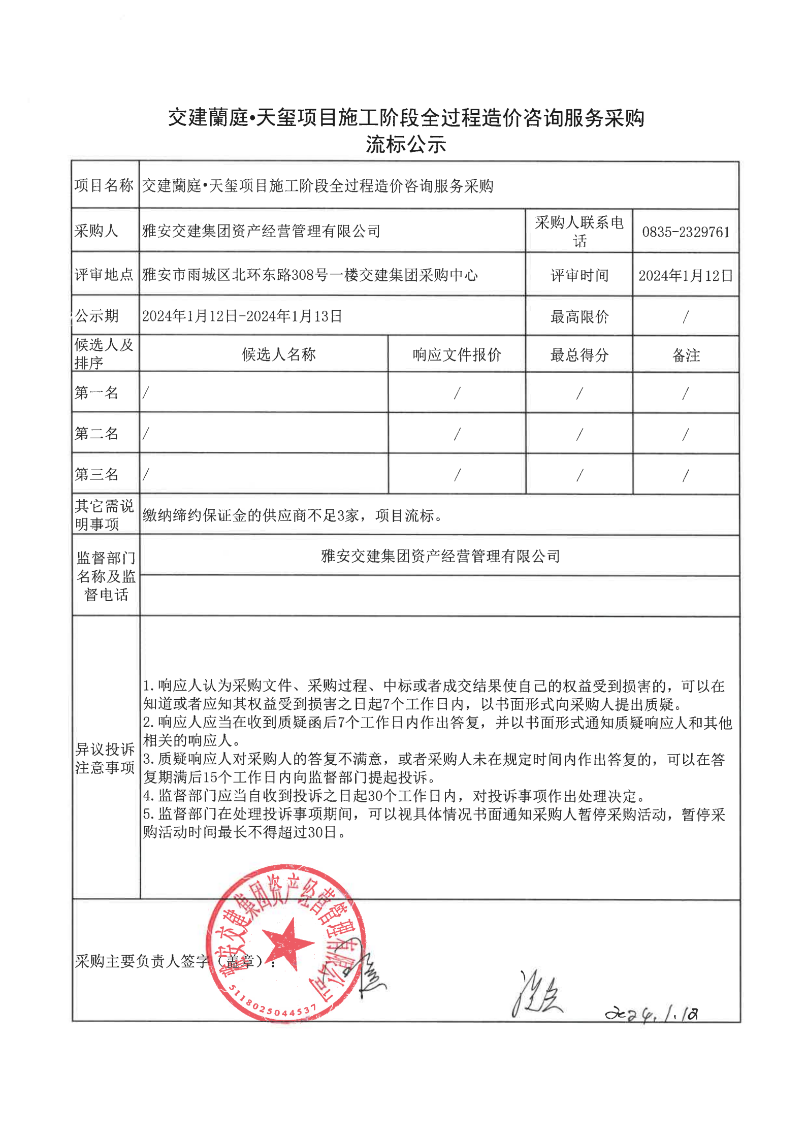 雅安交建集團資產經營管理有限公司交建蘭庭·天璽項目施工階段全過程造價咨詢服務采購流標公示