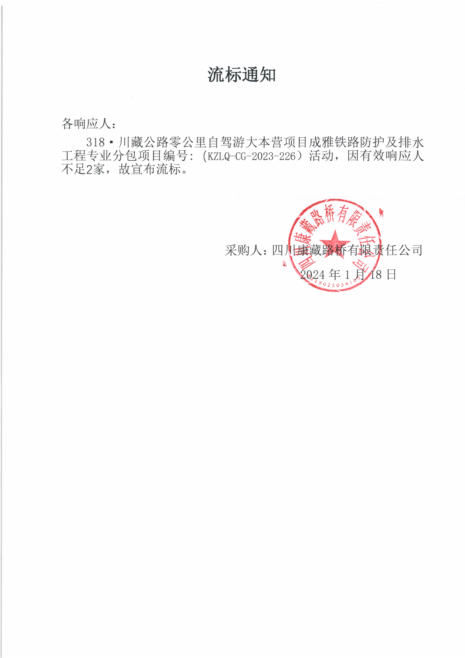 四川康藏路橋有限責(zé)任公司318·川藏公路零公里自駕游大本營項目成雅鐵路防護及排水工程專業(yè)分包項目流標通知