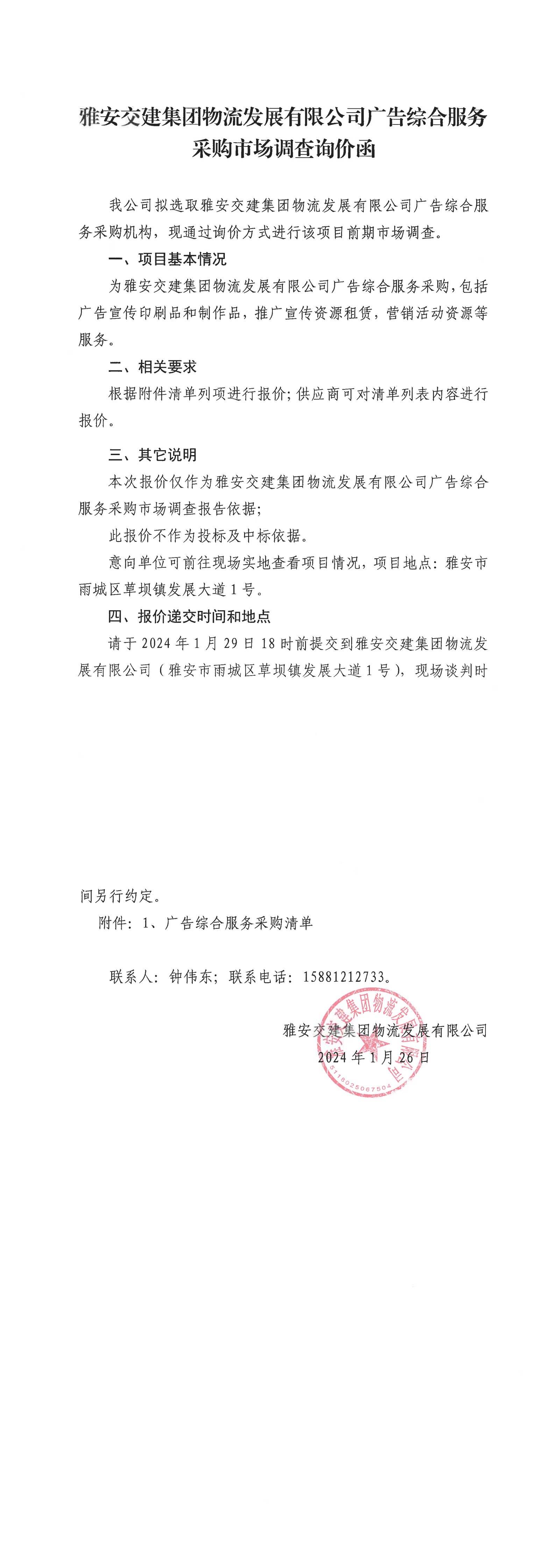雅安交建集團(tuán)物流發(fā)展有限公司廣告綜合服務(wù)采購市場調(diào)查詢價(jià)函