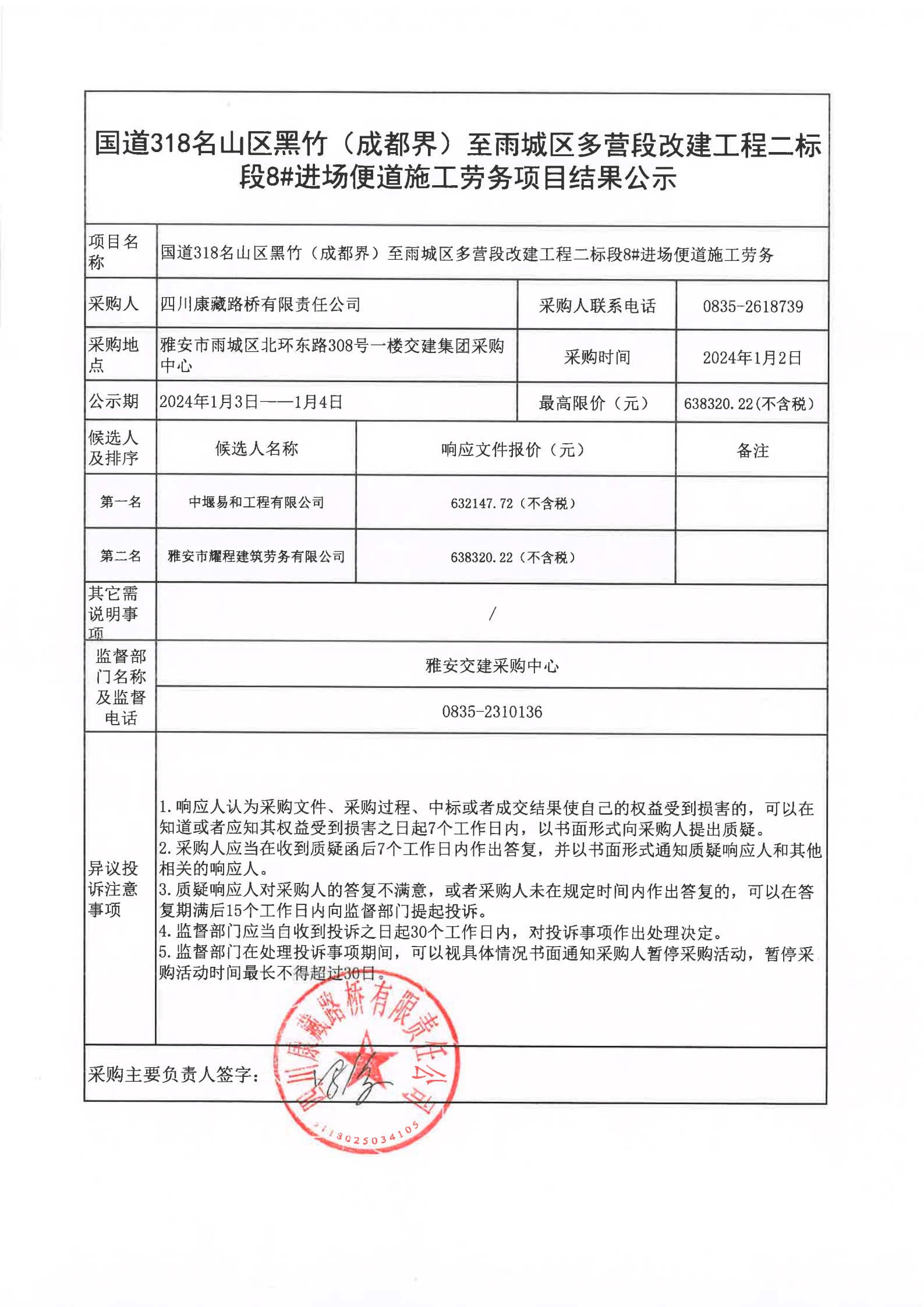 四川康藏路橋有限責(zé)任公司國道318名山區(qū)黑竹(成都界)至雨城區(qū)多營段改建工程二標(biāo)段8#進場便道施工勞務(wù)項目結(jié)果公示