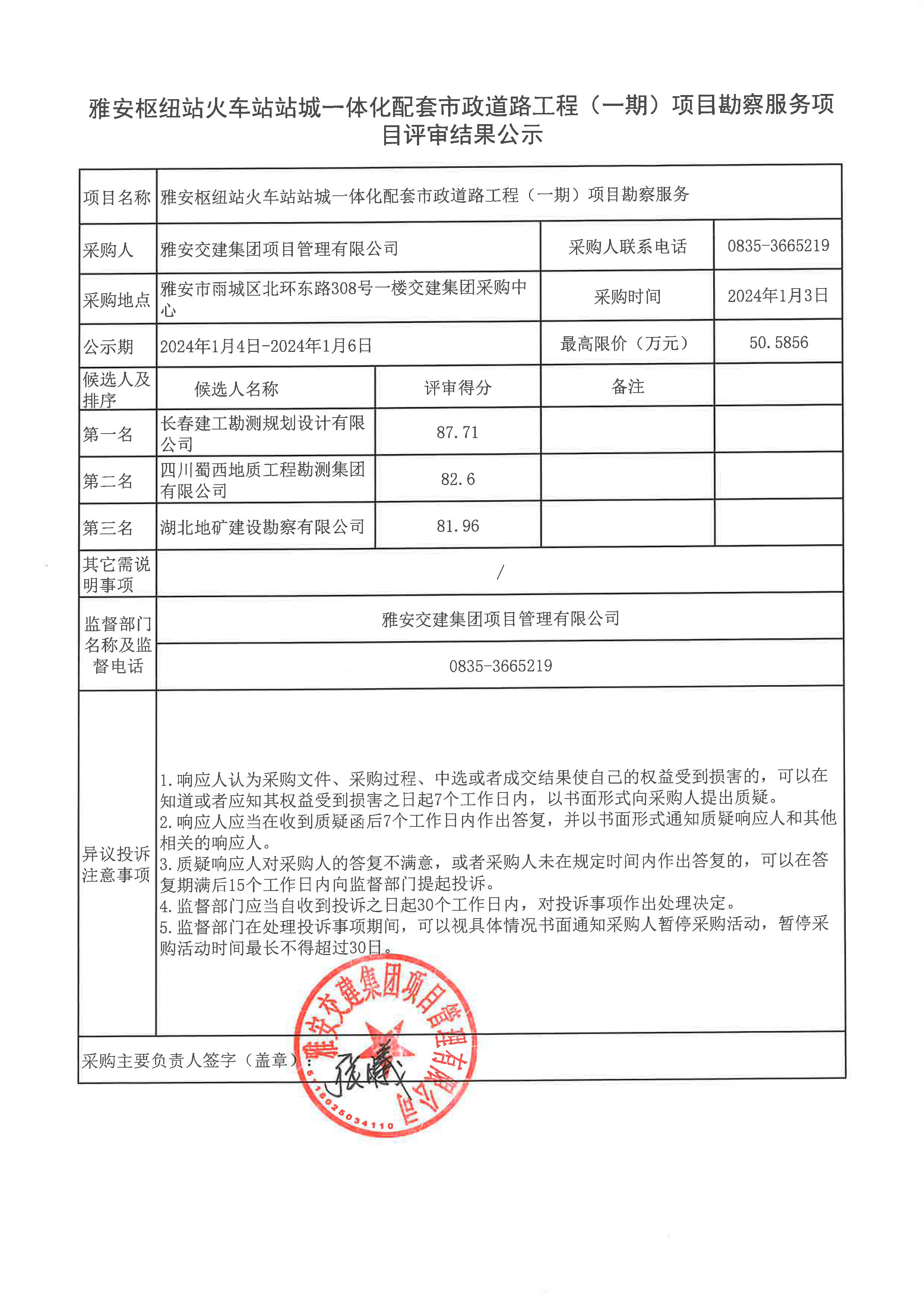 雅安交建集團(tuán)項(xiàng)目管理有限公司雅安樞紐站火車(chē)站站城一體化配套市政道路工程(一期) 項(xiàng)目勘察服務(wù)項(xiàng)目評(píng)審結(jié)果公示