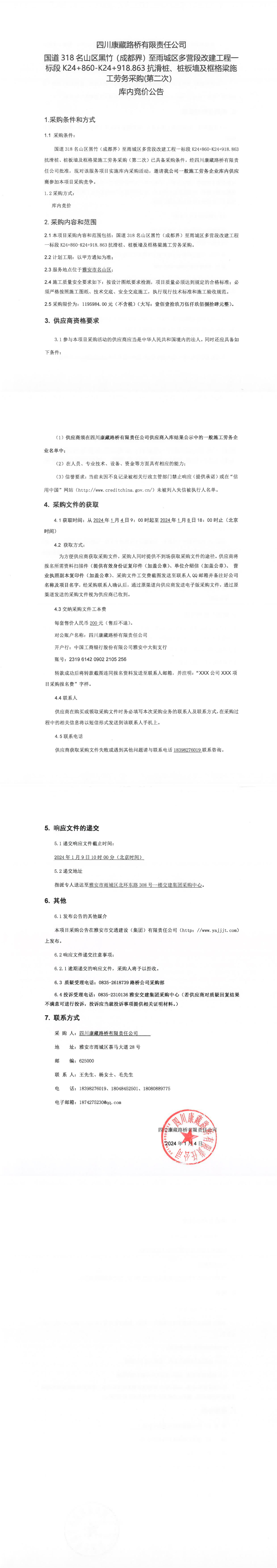 四川康藏路橋有限責(zé)任公司國道318名山區(qū)黑竹(成都界)至雨城區(qū)多營段改建工程一標段K24+860-K24+918.863抗滑樁、樁板墻及框格梁施工勞務(wù)采購(第二次)庫內(nèi)競價公告