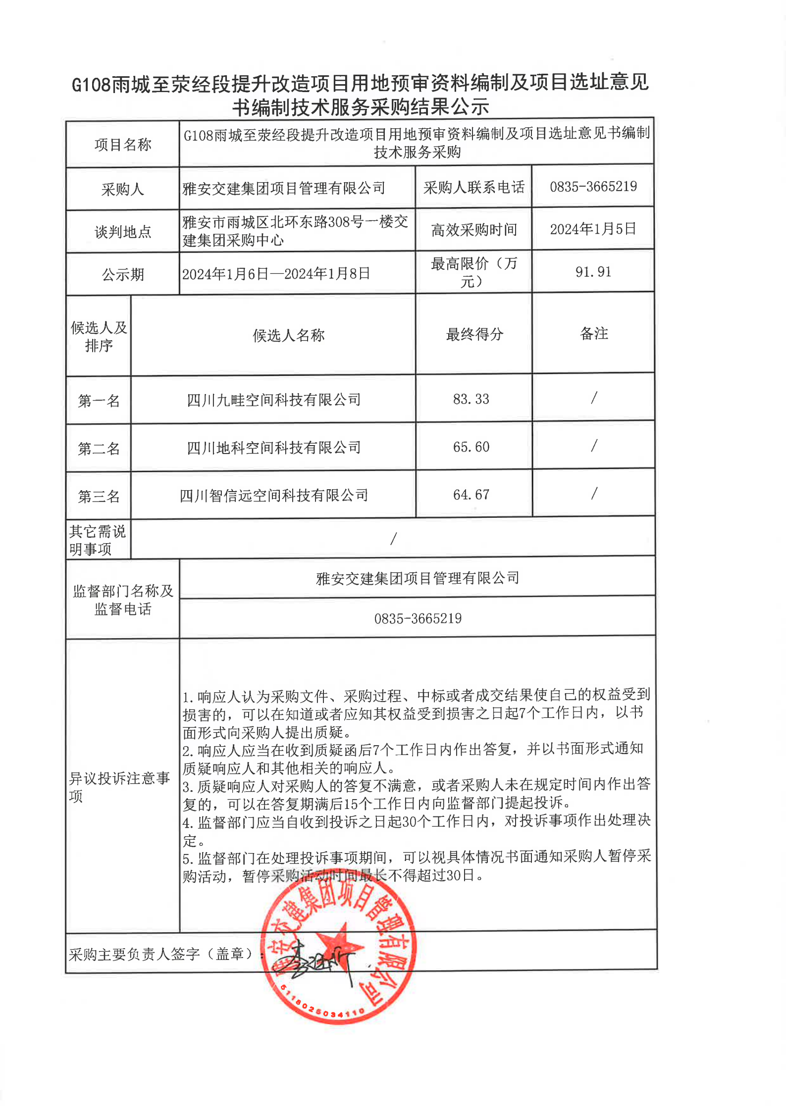 雅安交建集團(tuán)項(xiàng)目管理有限公司G108雨城至滎經(jīng)段提升改造項(xiàng)目用地預(yù)審資料編制及項(xiàng)目選址意見(jiàn)書編制技術(shù)服務(wù)采購(gòu)結(jié)果公示