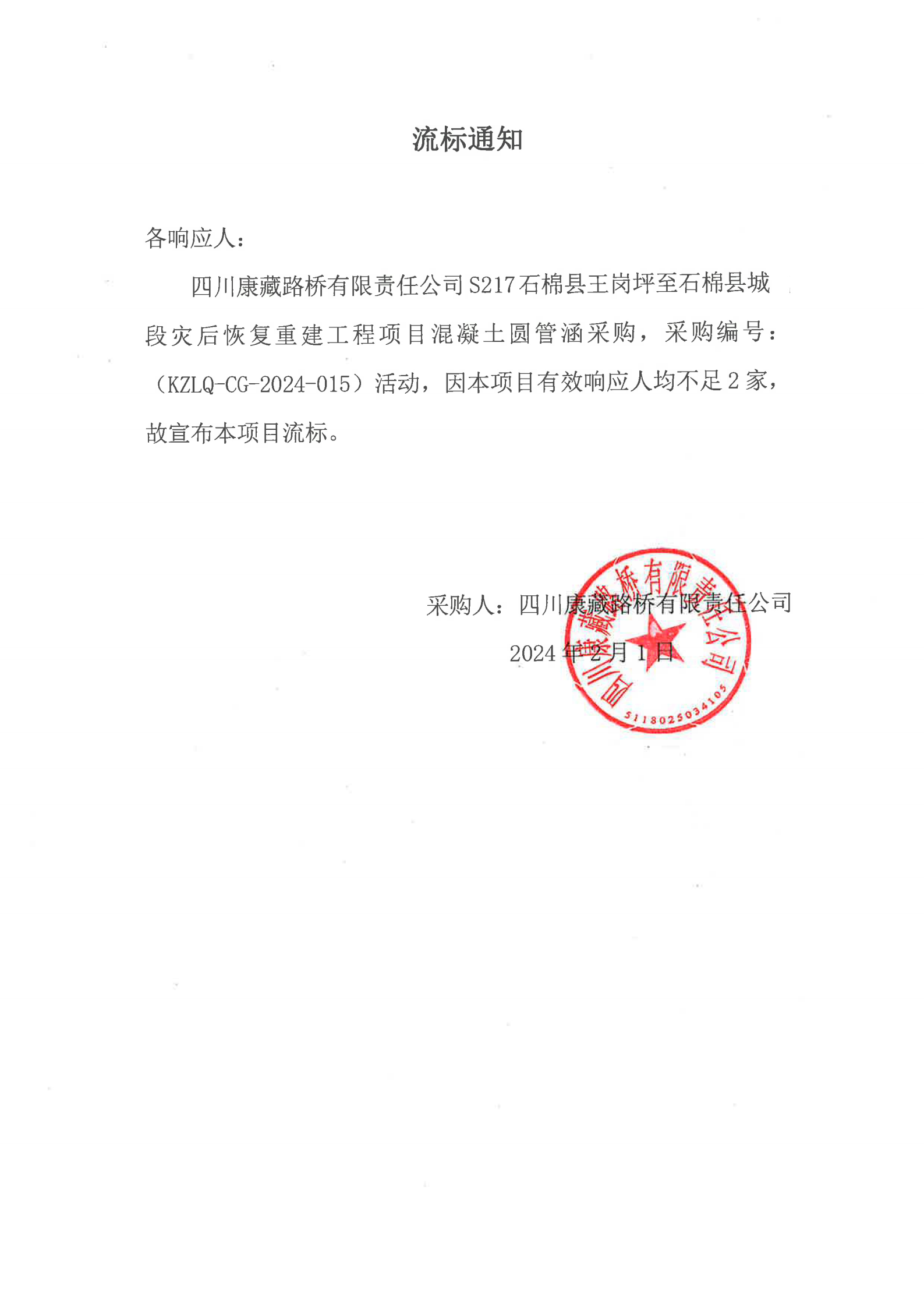 四川康藏路橋有限責(zé)任公司S217石棉縣王崗坪至石棉縣城段災(zāi)后恢復(fù)重建工程項(xiàng)目混凝土圓管涵采購(gòu)流標(biāo)通知