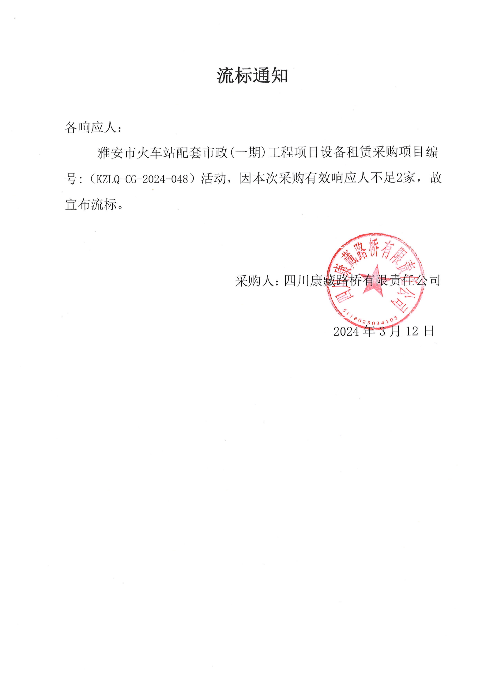 四川康藏路橋有限責(zé)任公司雅安市火車站配套市政(一期)工程項目設(shè)備租賃采購流標(biāo)通知