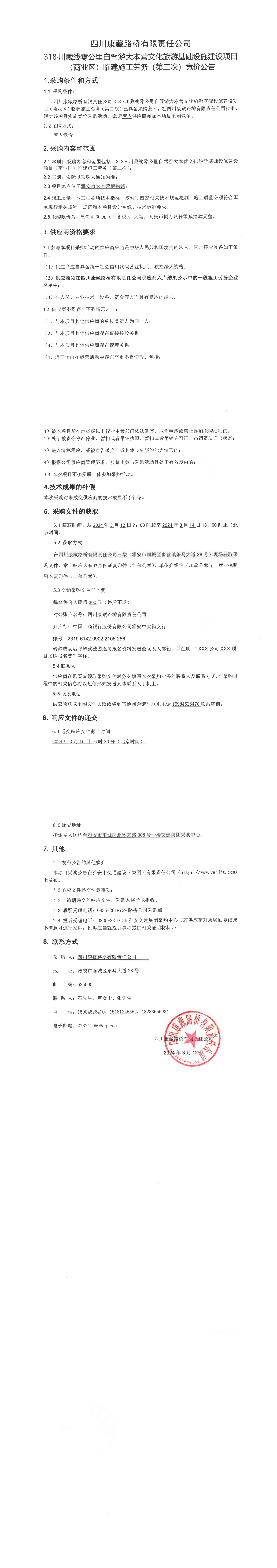 四川康藏路橋有限責(zé)任公司318·川藏公路零公里自駕游大本營文化旅游基礎(chǔ)設(shè)施建設(shè)項目(商業(yè)區(qū))臨建施工勞務(wù)(第二次)競價公告