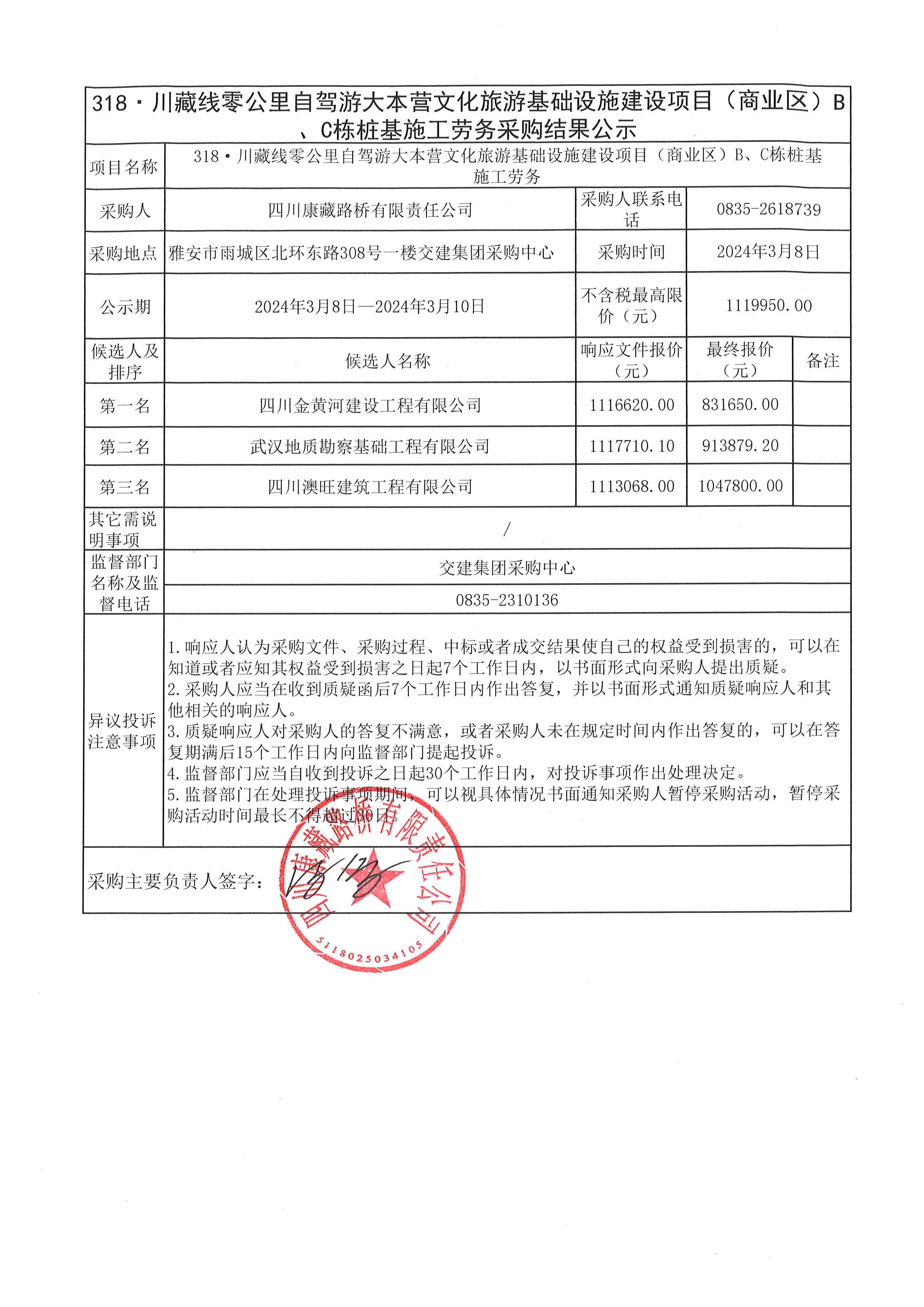 四川康藏路橋有限責任公司318·川藏線零公里自駕游大本營文化旅游基礎設施建設項目(商業(yè)區(qū))B、C棟樁基施工勞務結果公示