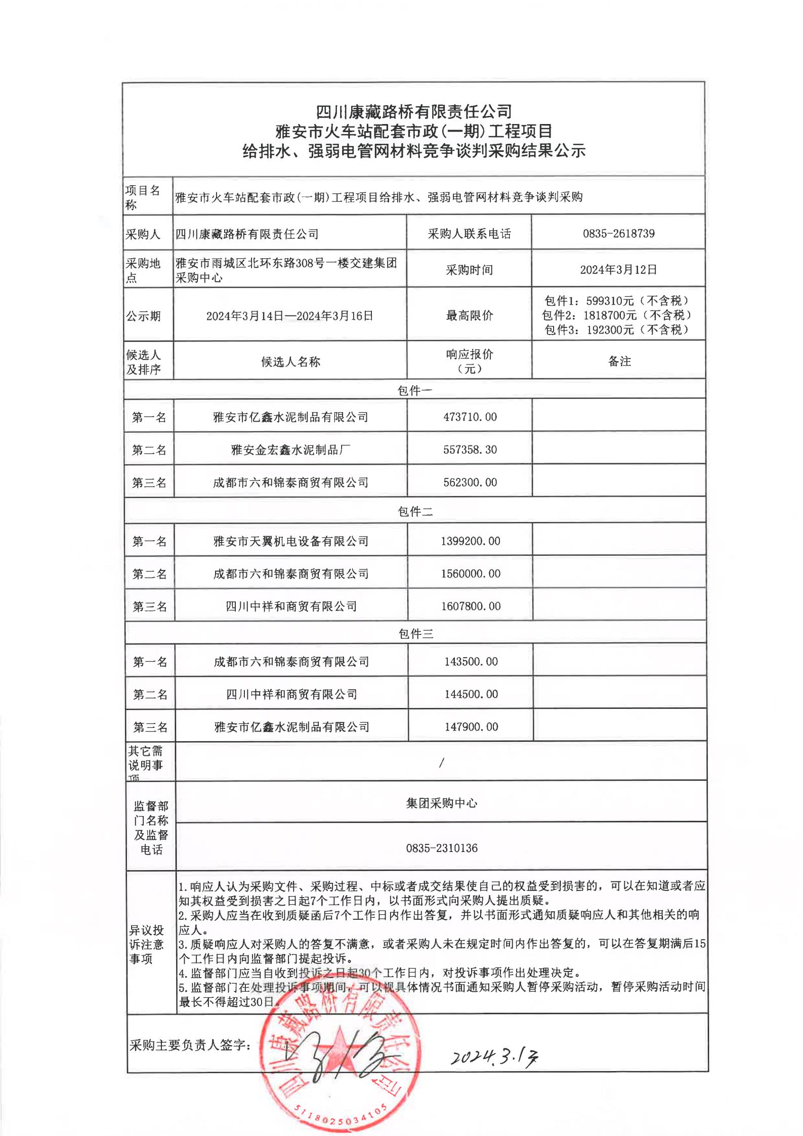 四川康藏路橋有限責(zé)任公司雅安市火車站配套市政(一期)工程項(xiàng)目給排水、強(qiáng)弱電管網(wǎng)材料采購(gòu)結(jié)果公示