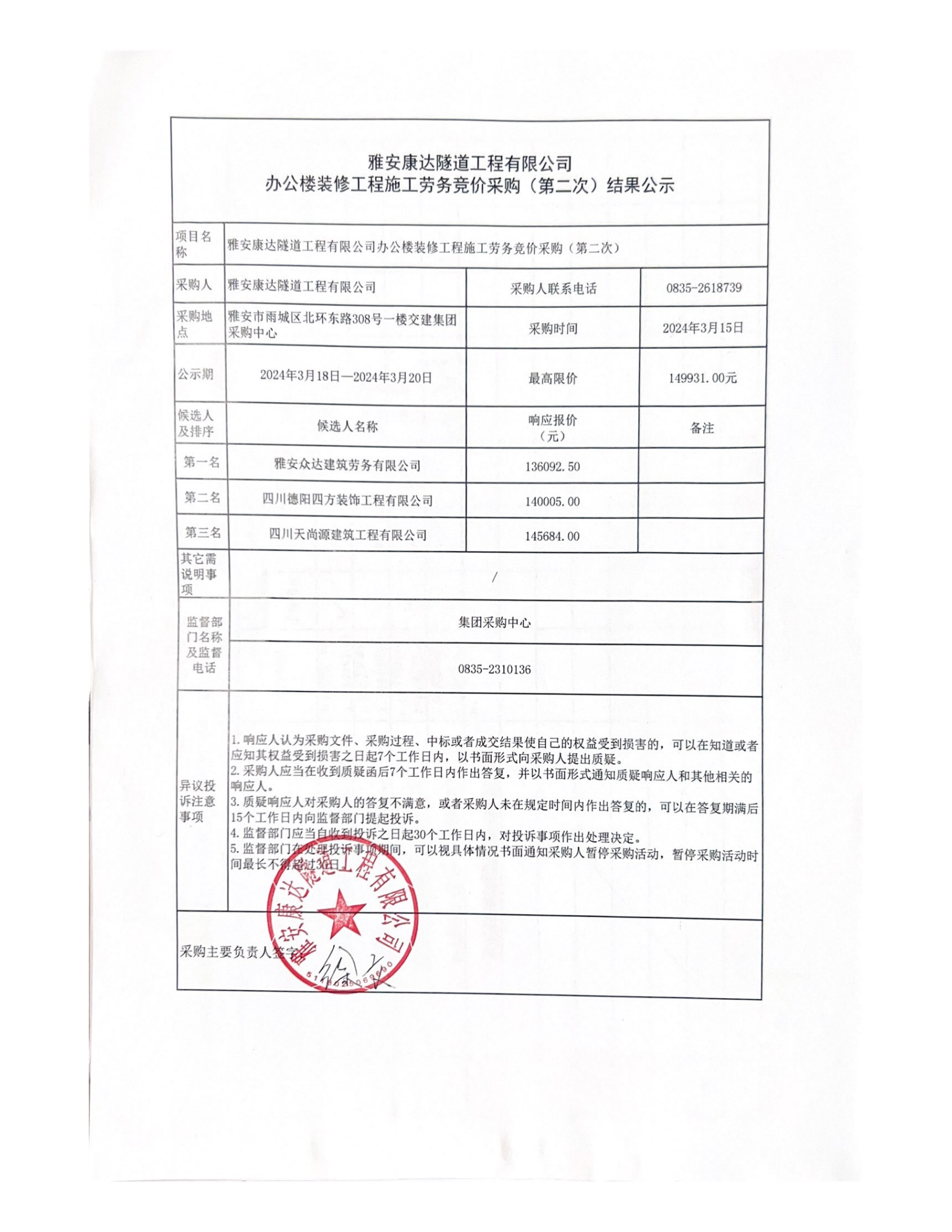 雅安康達隧道工程有限公司辦公樓裝修工程施工勞務競價采購(第二次)結(jié)果公示