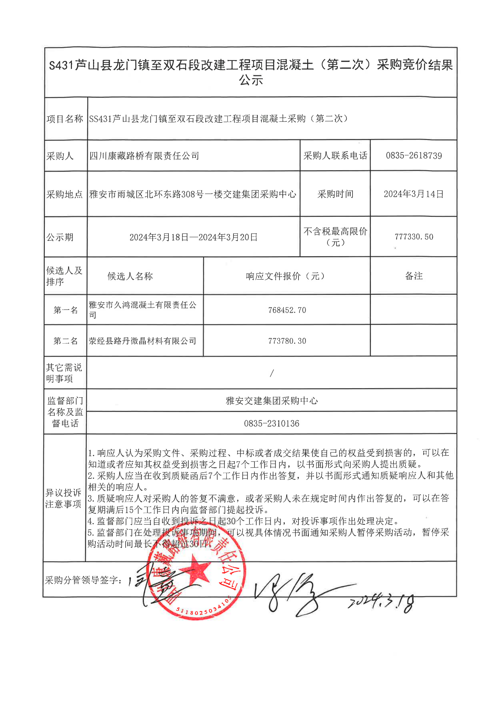 四川康藏路橋有限責(zé)任公司S431蘆山縣龍門鎮(zhèn)至雙石段改建工程項目混凝土(第二次)采購競價結(jié)果公示