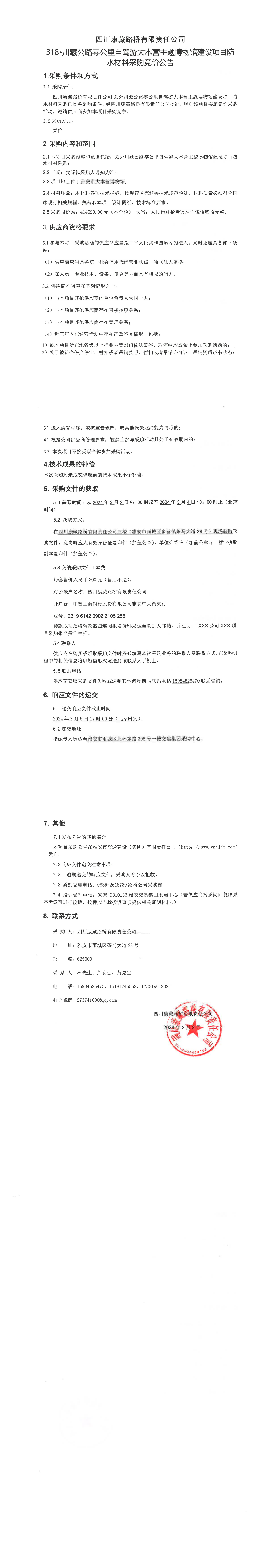四川康藏路橋有限責(zé)任公司318·川藏公路零公里自駕游大本營主題博物館建設(shè)項(xiàng)目防水材料采購競價公告