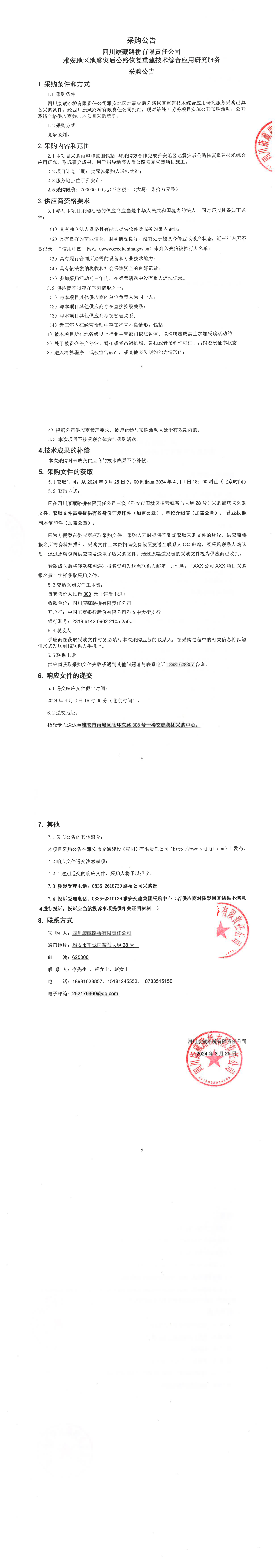 四川康藏路橋有限責任公司雅安地區(qū)地震災后公路恢復重建技術(shù)綜合應用研究服務采購公告