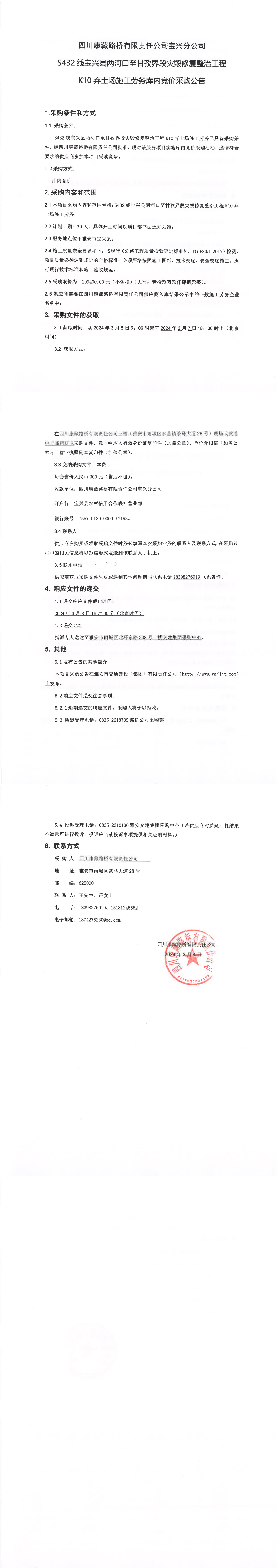 四川康藏路橋有限責任公司S432線寶興縣兩河口至甘孜界段災(zāi)毀修復整治工程K10棄土場施工勞務(wù)庫內(nèi)競價采購公告