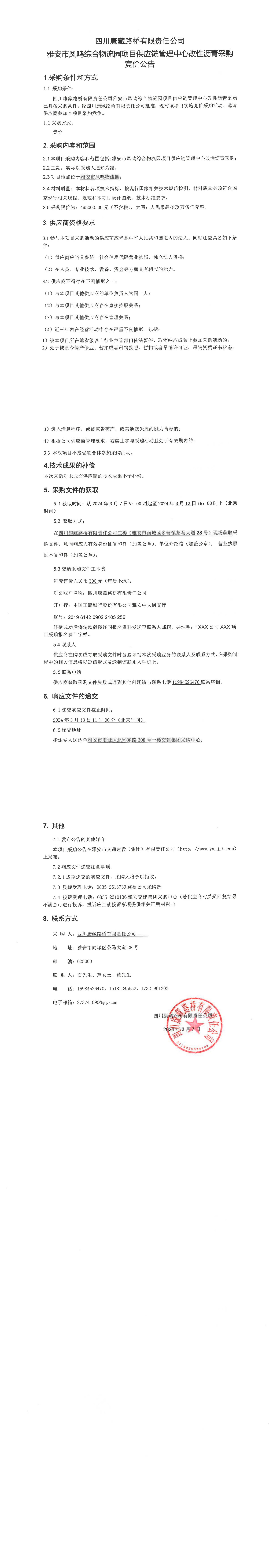 四川康藏路橋有限責(zé)任公司雅安市鳳鳴綜合物流園項(xiàng)目供應(yīng)鏈管理中心改性瀝青采購(gòu)競(jìng)價(jià)公告