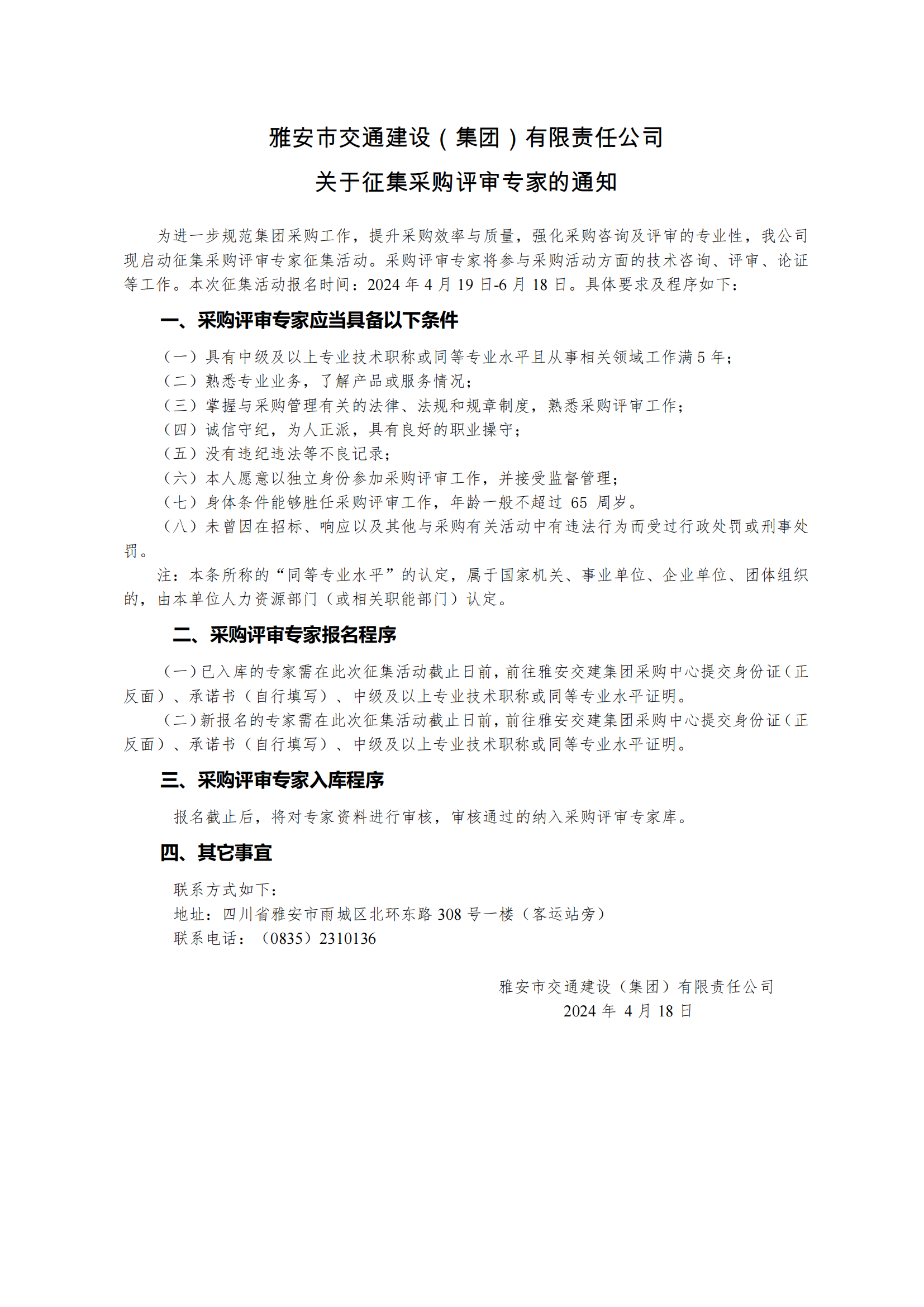 雅安市交通建設(集團)有限責任公司關于征集采購評審專家的通知