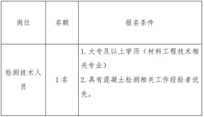 雅安交建集團(tuán)康居建設(shè)工程質(zhì)量與室內(nèi)環(huán)境污染檢測有限公司是雅安市交通建設(shè)(集團(tuán))有限責(zé)任公司下屬子公司,主要從事民用建筑室內(nèi)環(huán)境污染檢測業(yè)務(wù),F(xiàn)根據(jù)公司業(yè)務(wù)發(fā)展需要,擬向社會(huì)公開招聘1名技術(shù)檢測人員,現(xiàn)將有關(guān)事項(xiàng)公告如下: