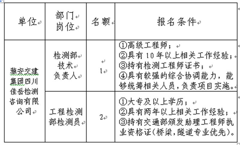根據(jù)發(fā)展需要,決定面向社會(huì)公開招聘雅安市交通建設(shè)(集團(tuán))有限責(zé)任公司(以下簡(jiǎn)稱“雅安交建集團(tuán)”)所屬子公司工作人員3名,現(xiàn)將有關(guān)事項(xiàng)公告如下: