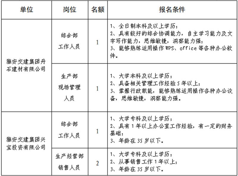 根據(jù)發(fā)展需要,決定面向社會公開招聘雅安市交通建設(shè)(集團)有限責任公司(以下簡稱“雅安交建集團”)所屬子公司工作人員5名,現(xiàn)將有關(guān)事項公告如下: