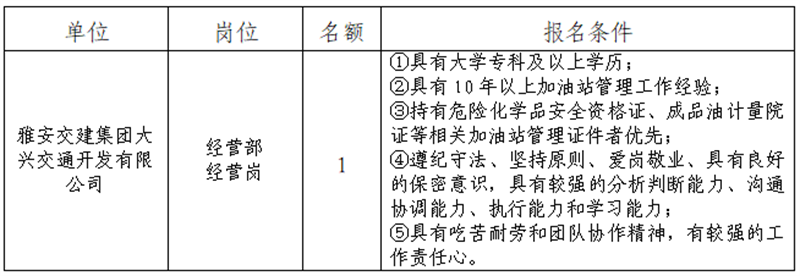 根據(jù)發(fā)展需要,決定面向社會公開招聘雅安市交通建設(shè)(集團(tuán))有限責(zé)任公司(以下簡稱“雅安交建集團(tuán)”)所屬子公司工作人員1名,現(xiàn)將有關(guān)事項(xiàng)公告如下: