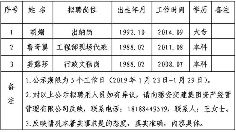 雅安交建集團資產經營管理有限公司擬聘用人員公示