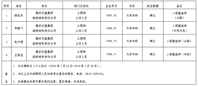 雅安交建集團子公司擬聘用人員公示(路橋公司)