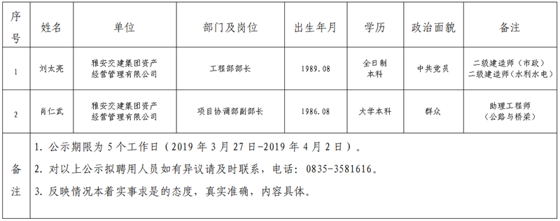 雅安交建集團子公司擬聘用人員公示(路橋公司)