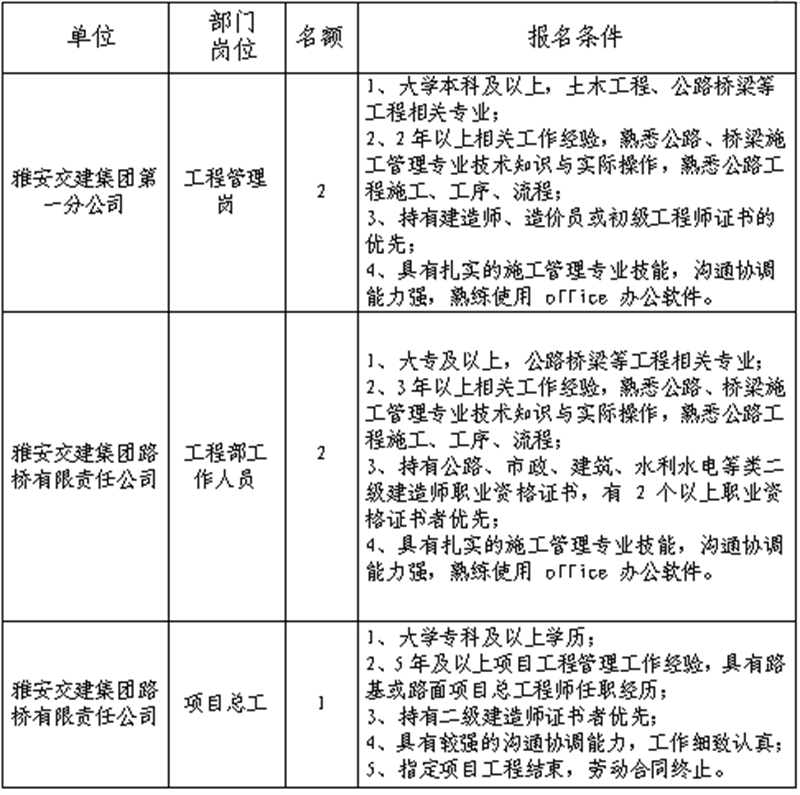根據(jù)發(fā)展需要,決定面向社會公開招聘雅安市交通建設(shè)(集團)有限責任公司(以下簡稱“雅安交建集團”)所屬分子公司工作人員5名,現(xiàn)將有關(guān)事項公告如下: