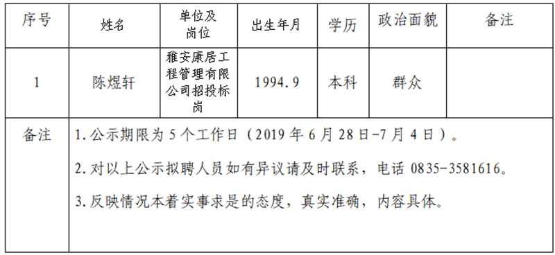 雅安交建集團子公司擬聘用人員公示 (康居公司)