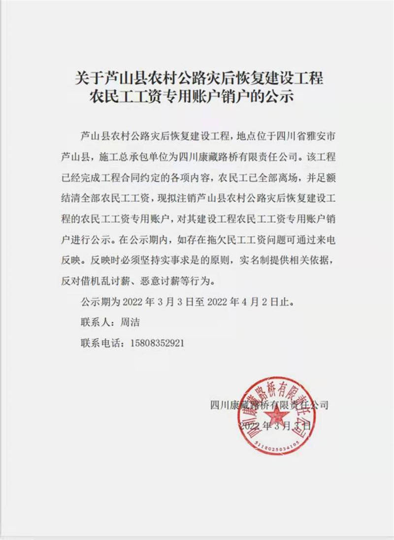 關(guān)于蘆山縣農(nóng)村公路災(zāi)后恢復(fù)建設(shè)工程 農(nóng)民工工資專用賬戶銷戶的公示
