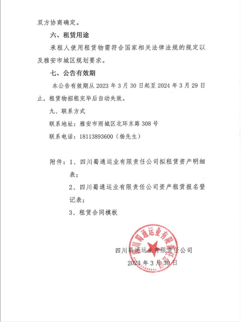 蜀通運業(yè)有限責(zé)任公司關(guān)于閑置資產(chǎn)公開招租的公告附件