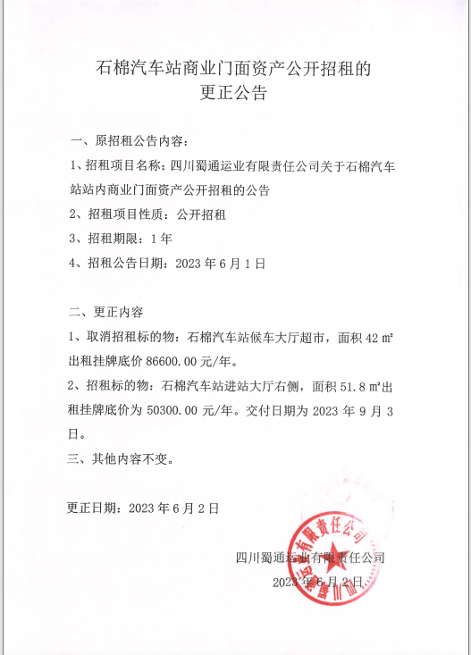 蜀通公司石棉汽車站商業(yè)門(mén)面資產(chǎn)公開(kāi)招租的更正公告