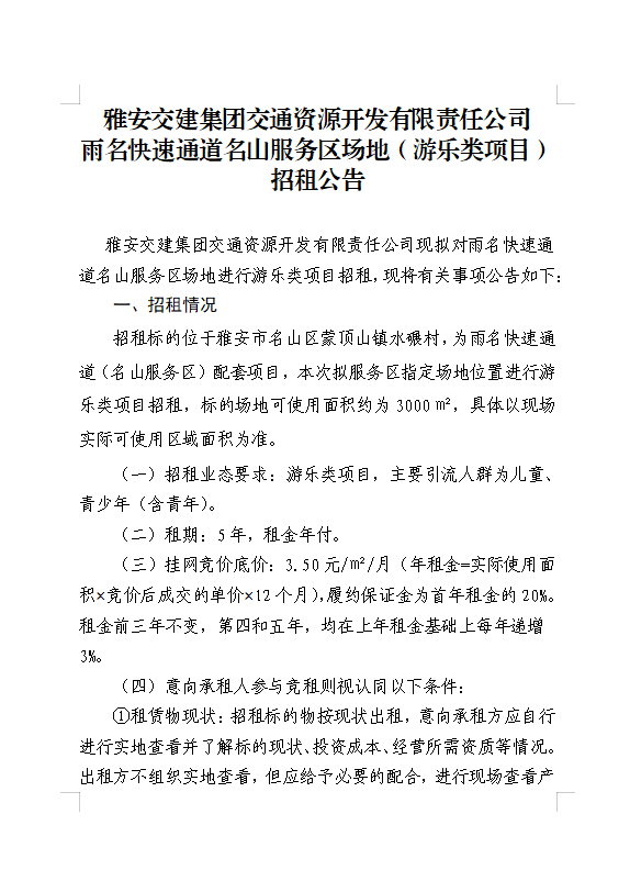 雅安交建集團交通資源開發(fā)有限責(zé)任公司雨名快速通道名山服務(wù)區(qū)場地(游樂類項目)招租公告