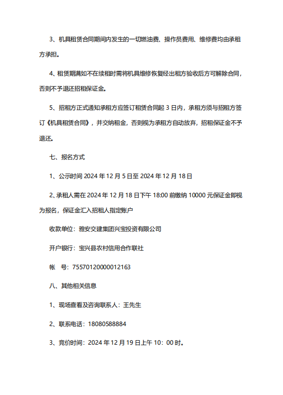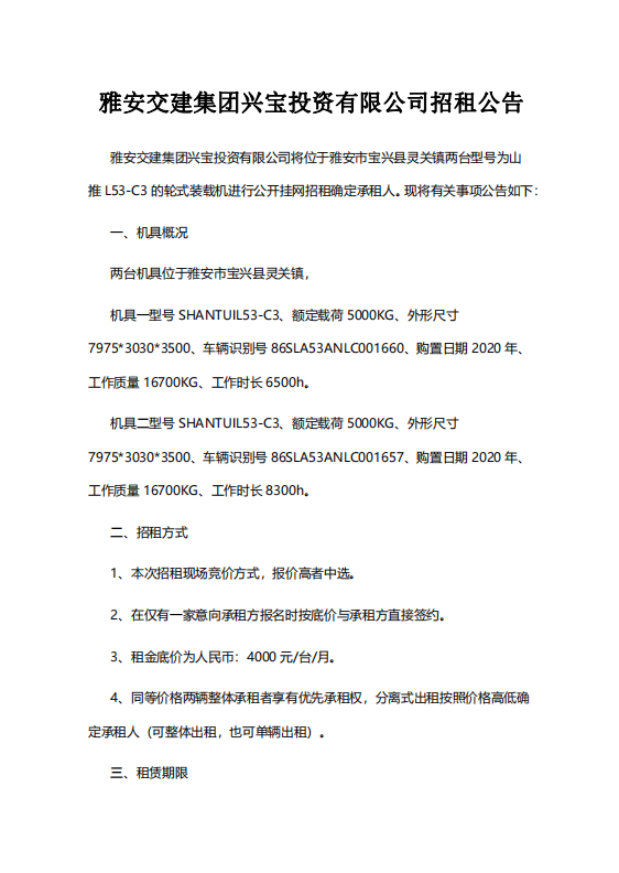 雅安交建集團(tuán)興寶投資有限公司招租公告