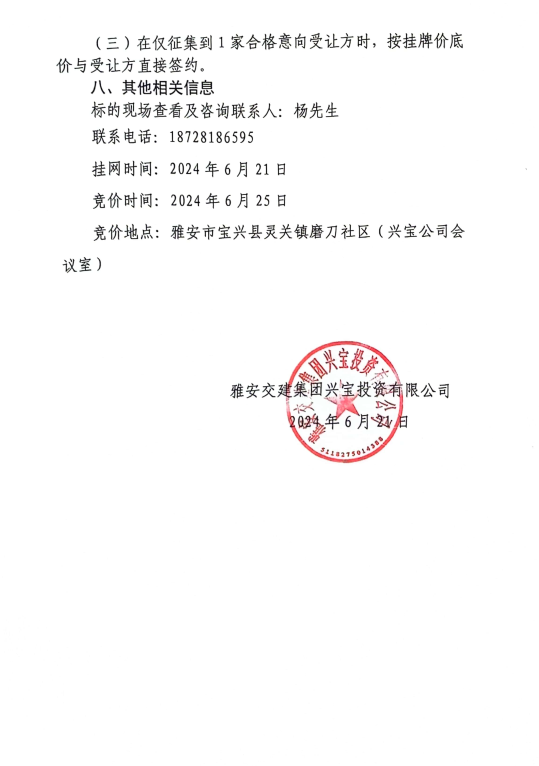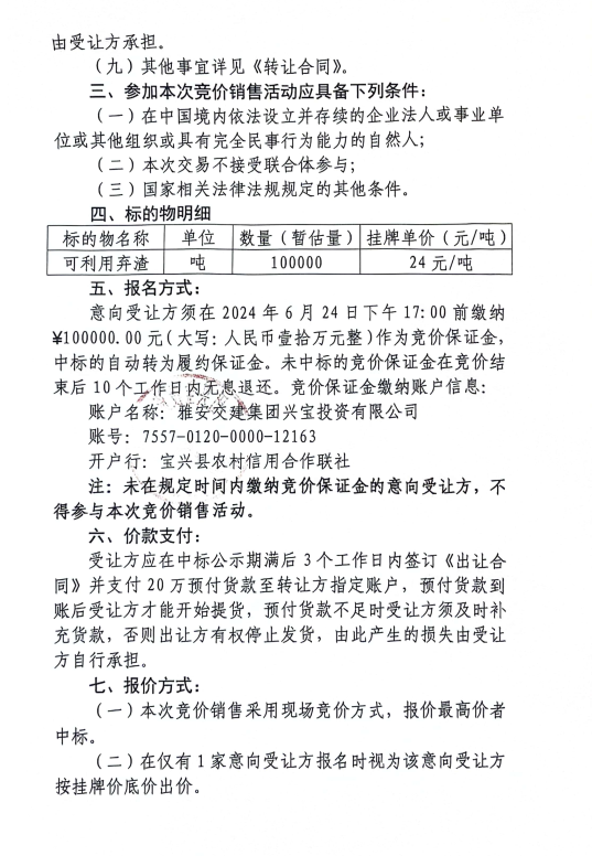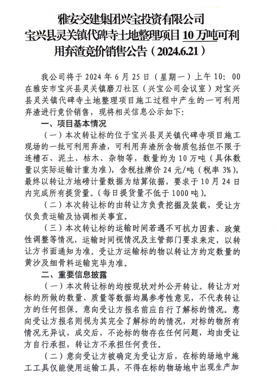 雅安交建集團(tuán)興寶投資有限公司寶興縣靈關(guān)鎮(zhèn)代碑寺土地整理項(xiàng)目10萬(wàn)噸可利用棄渣競(jìng)價(jià)銷(xiāo)售公告(2024.6.21)