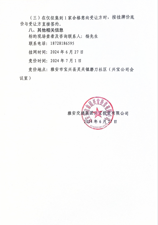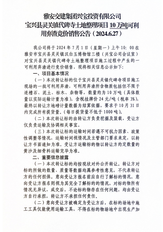 雅安交建集團(tuán)興寶投資有限公司寶興縣靈關(guān)鎮(zhèn)代碑寺土地整理項(xiàng)目10萬(wàn)噸可利用棄渣競(jìng)價(jià)銷售公告(2024.6.27)