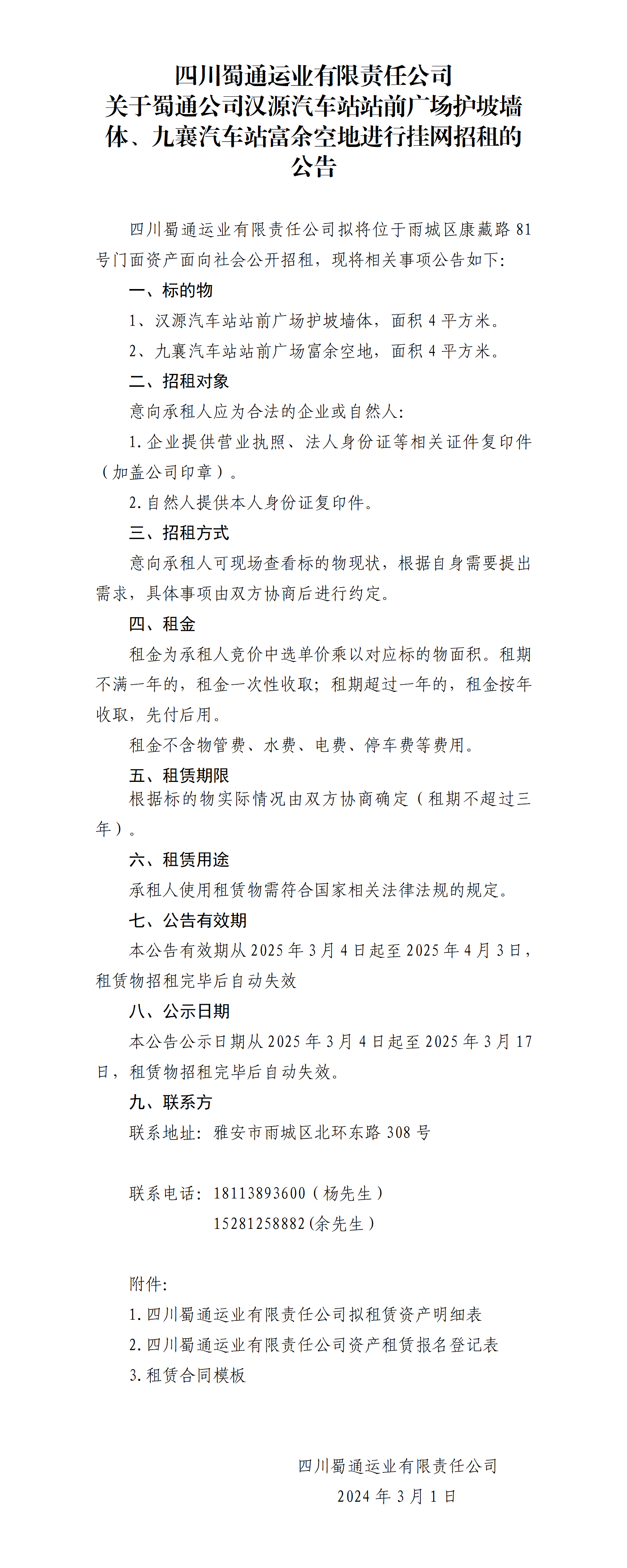 四川蜀通運業(yè)有限責(zé)任公司 關(guān)于蜀通公司漢源汽車站站前廣場護坡墻體、九襄汽車站富余空地進(jìn)行掛網(wǎng)招租的公告