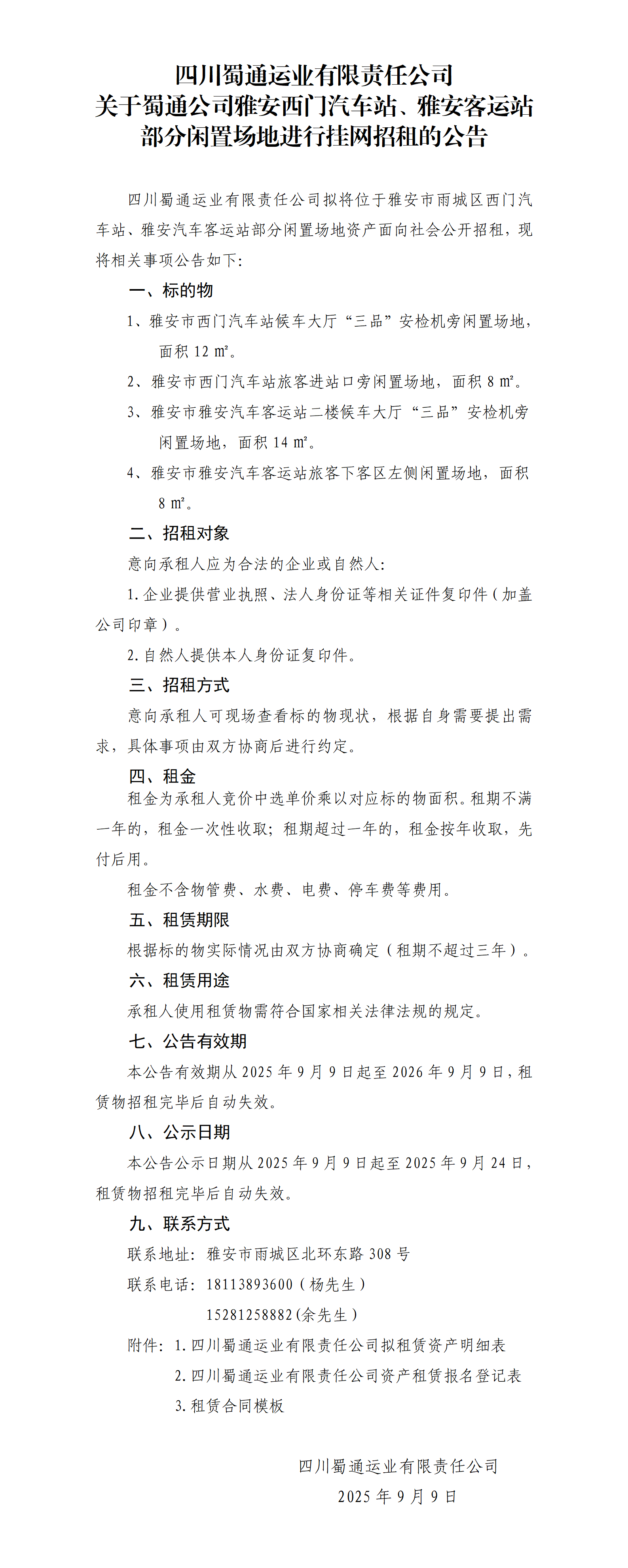四川蜀通運業(yè)有限責(zé)任公司 關(guān)于蜀通公司雅安西門汽車站、雅安客運站部分閑置場地進行掛網(wǎng)招租的公告