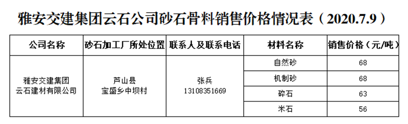 雅安交建集團云石公司砂石骨料銷售價格情況表(2020.7.9)