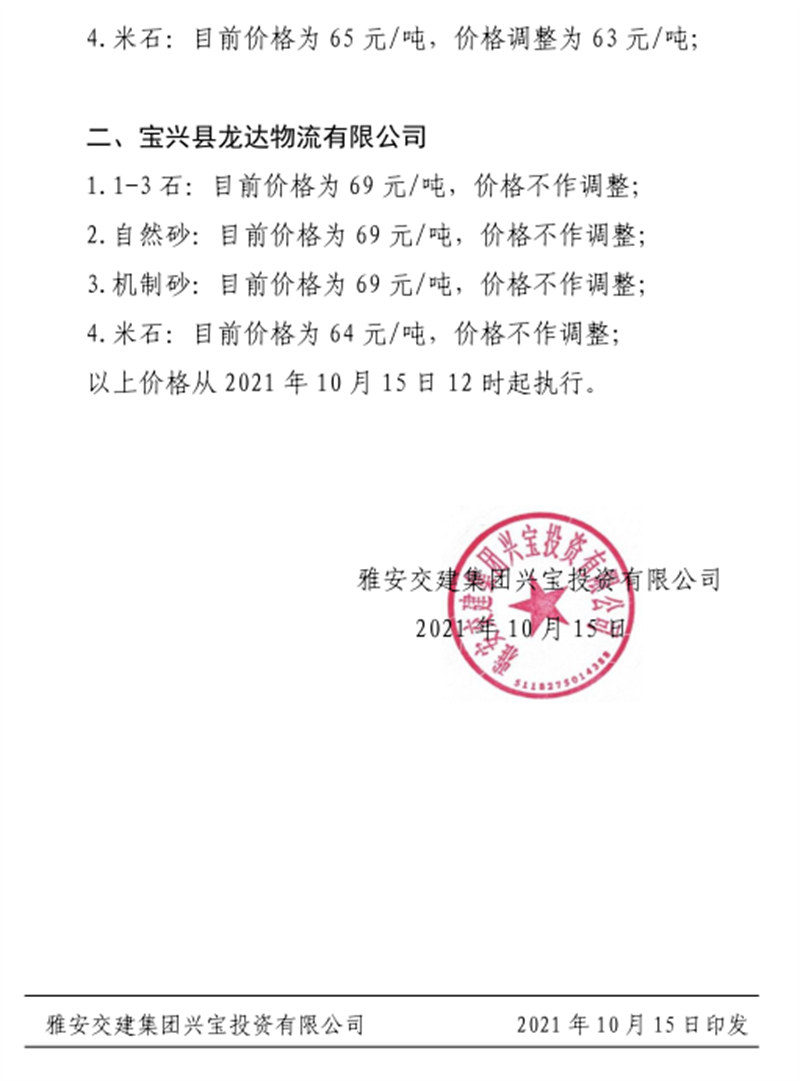 雅安交建集團興寶公司關(guān)于調(diào)整成品料銷售價格的通知(2021.10.15)